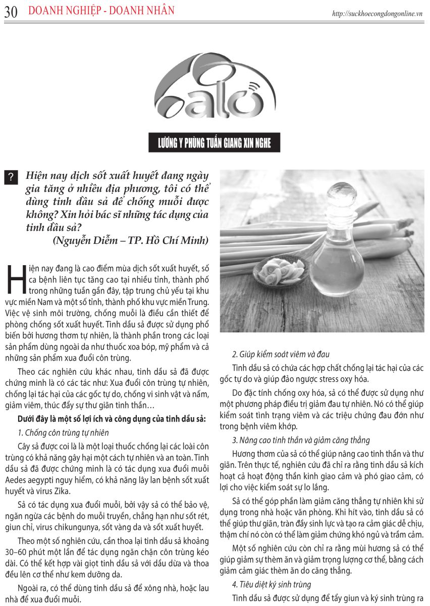 Hỏi: Đợt này tôi thấy có nhiều người bị sốt xuất huyết, tôi có thể dùng tinh dầu sả để chống muỗi được không? Xin hỏi bác sĩ những tác dụng của tinh dầu sả?
