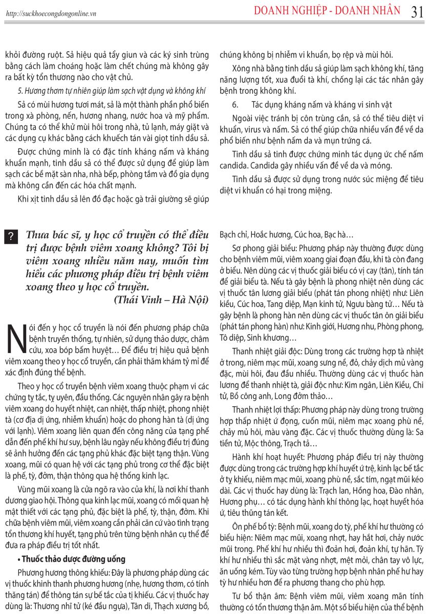 Hỏi: Thưa bác sĩ, y học cổ truyền có thể điều trị được bệnh viêm xoang không? Tôi bị viêm xoang nhiều năm nay, muốn tìm hiểu các phương pháp điều trị bệnh viêm xoang theo y học cổ truyền.