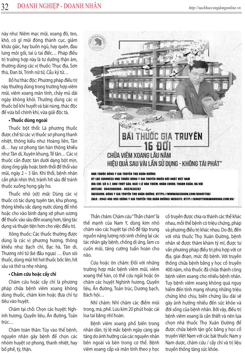 Bệnh viêm xoang phổ biến trong nhân dân, tỷ lệ mắc bệnh ngày càng gia tăng do ảnh hưởng của các nguyên nhân bên ngoài và bên trong cơ thể. Bệnh viêm xoang cấp và mãn tính theo y học cổ truyền được chia ra thành các thể khác nhau, mỗi thể bệnh có triệu chứng, pháp và phương điều trị khác nhau. Do đó, đến với nhà thuốc Thọ Xuân Đường, bệnh nhân sẽ được thăm khám tỷ mỉ, được tư vấn phương pháp điều trị phù hợp với cơ địa, giai đoạn, mức độ bệnh. Với truyền thống chữa bệnh bằng y học cổ truyền 400 năm, nhà thuốc đã chữa thành công bệnh viêm xoang cho nhiều bệnh nhân. Tuy bệnh viêm xoang không quá nguy hiểm đến tính mạng nhưng những triệu chứng khó chịu, biến chứng lâu dài sẽ gây ảnh hưởng nhiều đến sức khỏe và đời sống của bệnh nhân. Bởi vậy, điều trị bệnh viêm xoang là cần thiết và nên lựa chọn nhà thuốc Thọ Xuân Đường để được chữa bệnh tận gốc bằng y học cổ truyền Việt Nam với các bài thuốc Nam y Nam dược, châm cứu / cấy chỉ và trị liệu truyền thống tăng sức khỏe.
