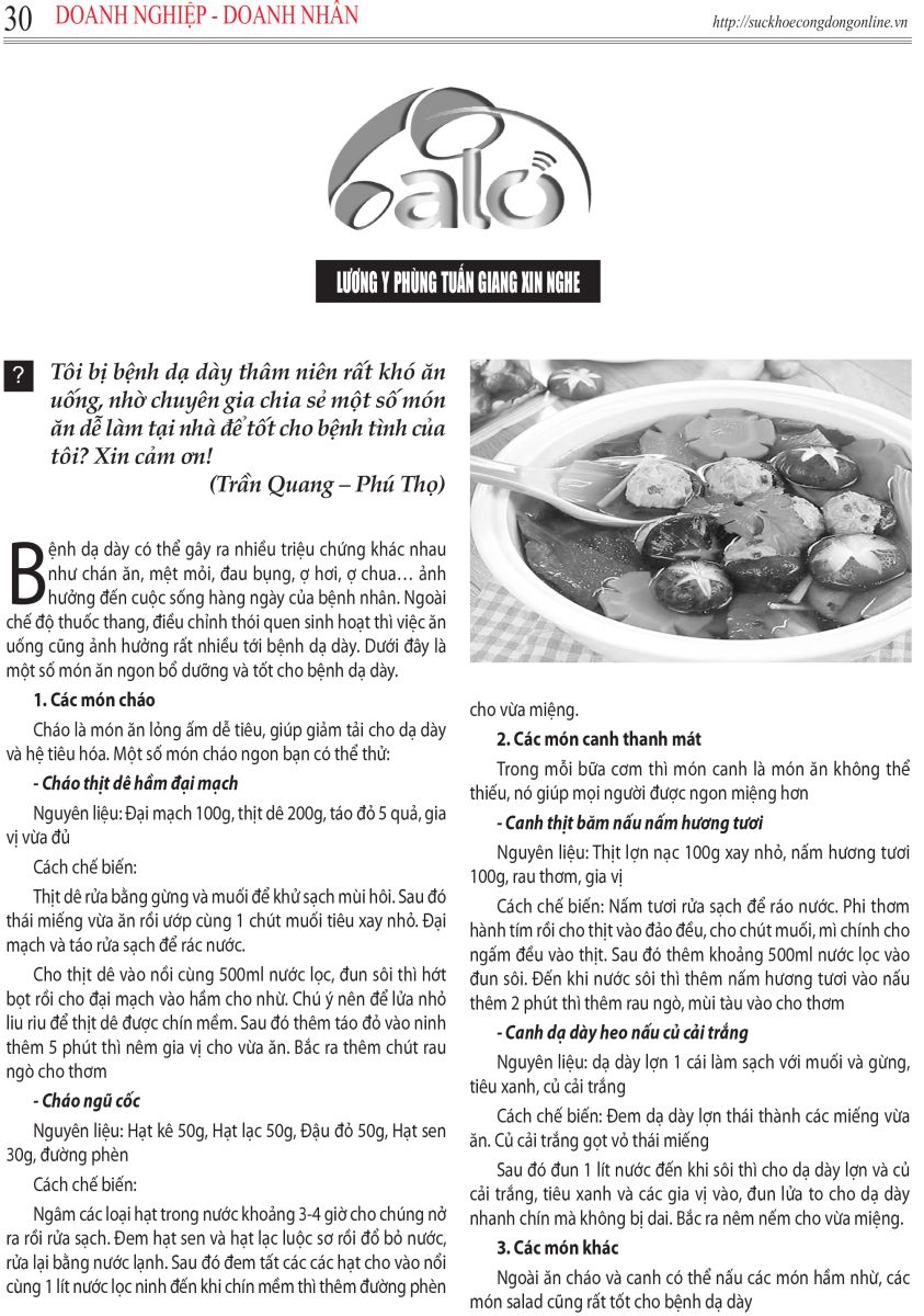 Hỏi: Tôi bị bệnh dạ dày thâm niên rất khó ăn uống, nhờ chuyên gia chia sẻ một số món ăn dễ làm tại nhà để tốt cho bệnh tình của tôi? Xin cảm ơn !
