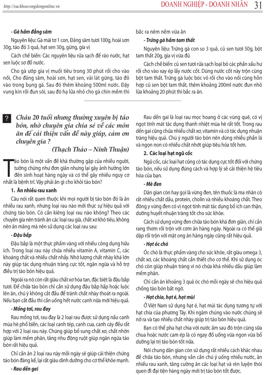 Hỏi: Cháu 20 tuổi nhưng thường xuyên bị táo bón, nhờ chuyên gia chia sẻ về các món ăn để cải thiện vấn đề này giúp, cảm ơn chuyên gia ?